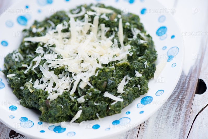 Жареный шпинат с сыром пармезан в тарелке