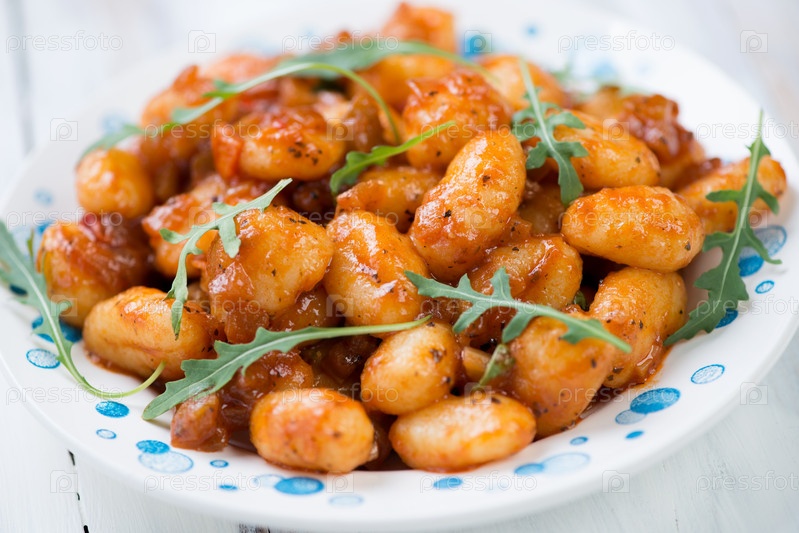 Вареные ньокки с томатным соусом и рукколой