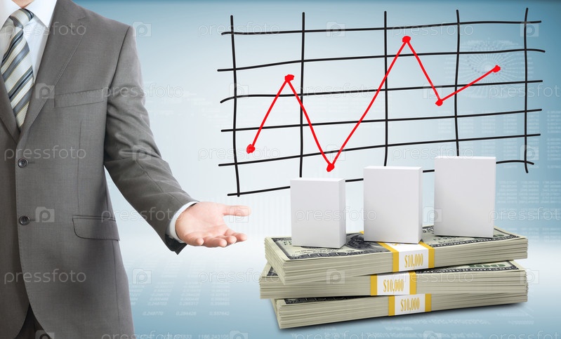 Бизнесмен, график и пачка денег