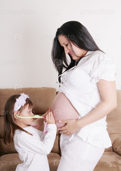 Девочка, слушающая живот матери