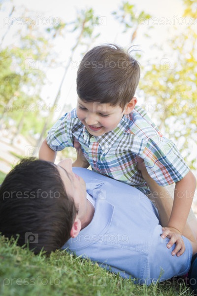 Отец и сын играют в парке