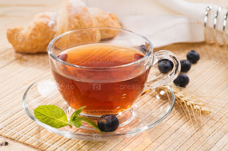 Чашка черного чая с мятой и свежие ягоды голубики