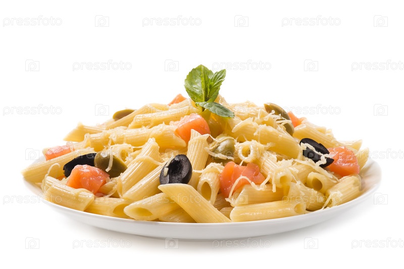 Итальянская паста с копченым лососем на белом фоне