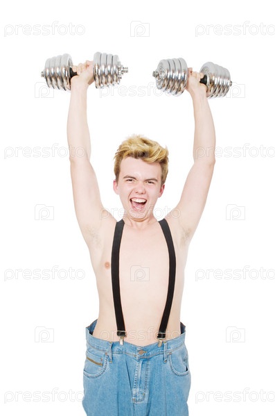 Забавный мужчина с гантелями