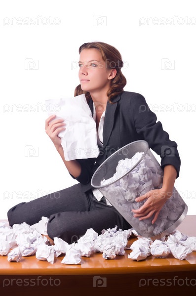 Женщина с кучей скомканной бумаги