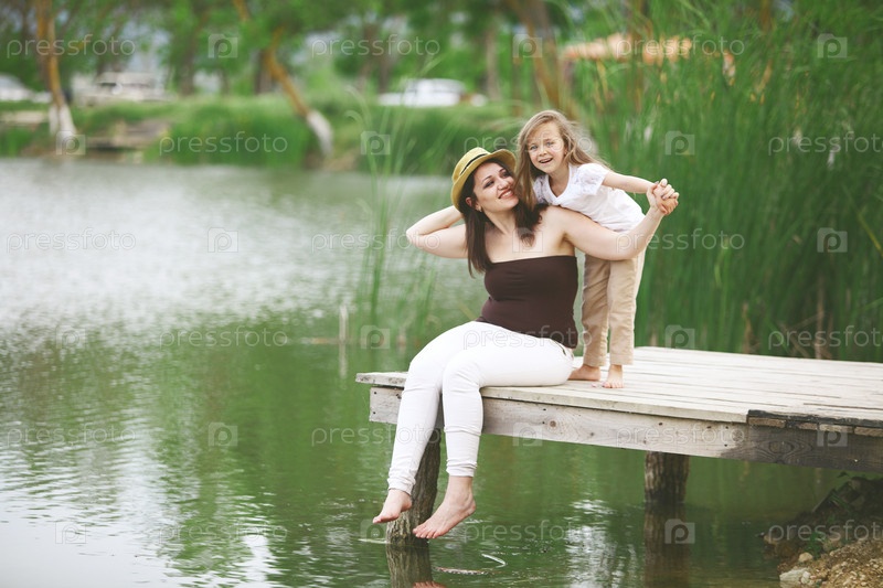 Семья отдыхает возле пруда