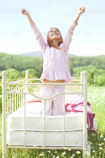 Девочка позирует на кровати в поле