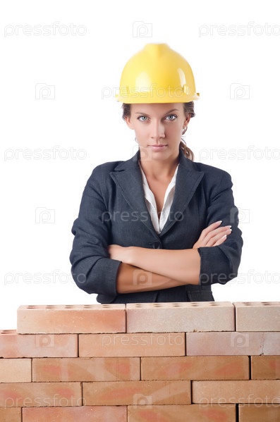 Строитель возле кирпичной стены