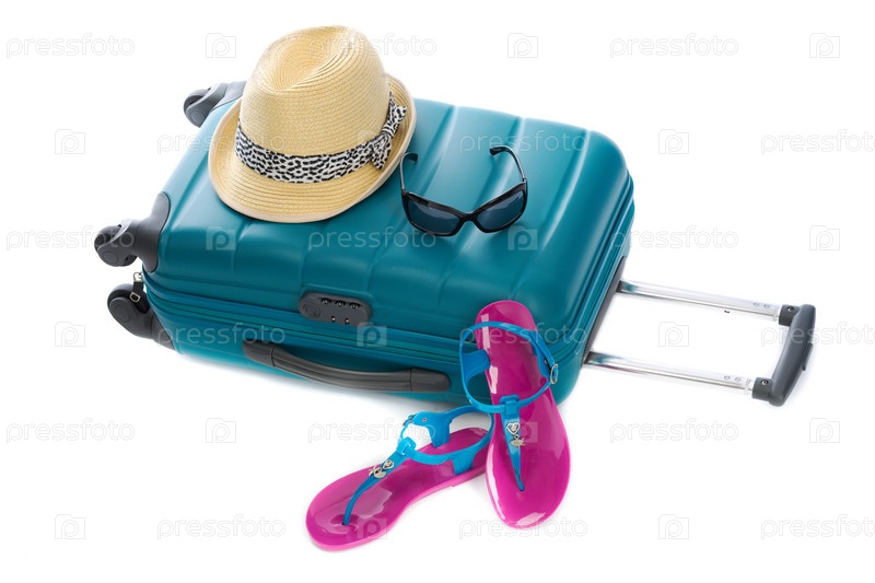 Чемодан, шляпа, солнцезащитные очки и сланцы