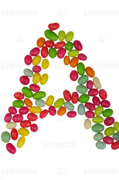 Буква А из разноцветных драже на белом фоне