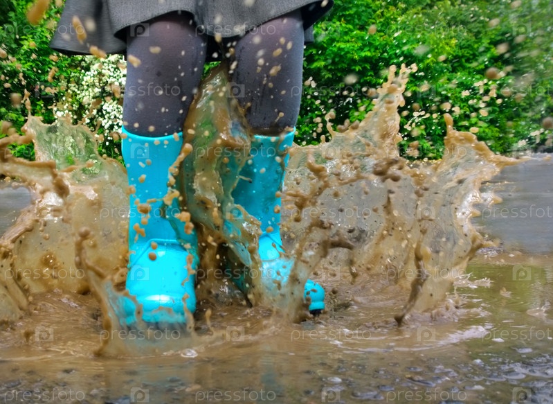 Ребенок в сапогах прыгает в луже