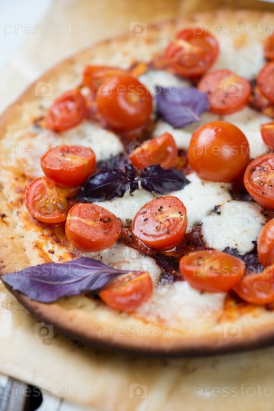 Пицца с моцареллой, помидорами черри и базиликом