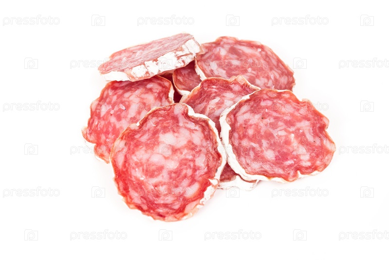 Ломтики салями, изолированные на белом