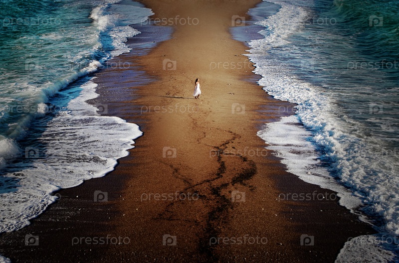 Девушка на песчаной косе в море