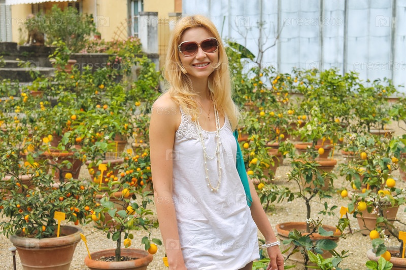 Девушка возле горшечных растений в теплице