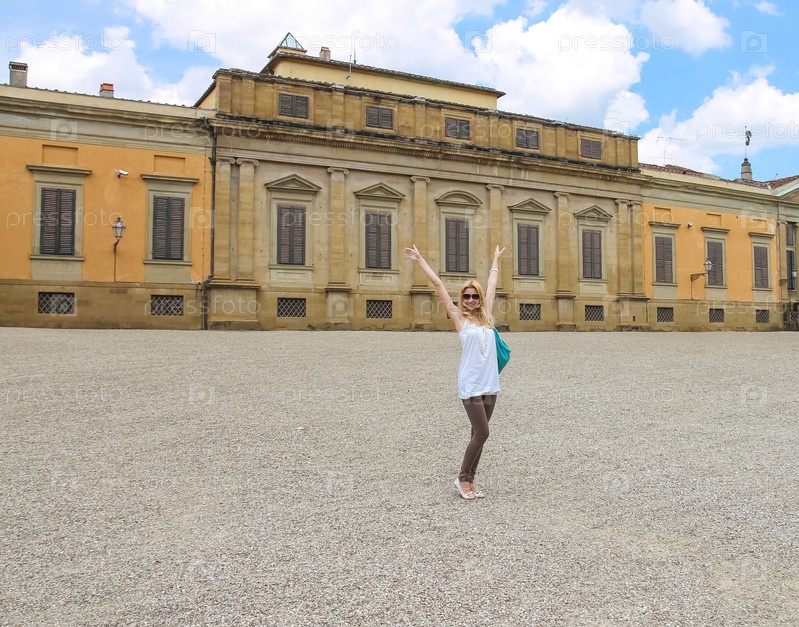 Привлекательная девушка возле дворца Питти в саду Боболи, Флоренция, Италия