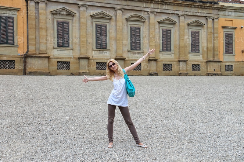 Привлекательная девушка возле дворца Питти в саду Боболи, Флоренция, Италия