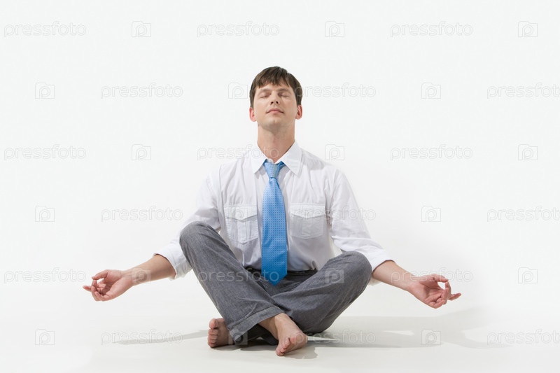 Мужчина в рубашке и галстуке медитирует сидя на полу