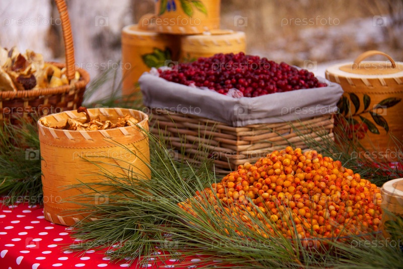 Дары Сибири - облепиха, брусника и грибы в берестяных туесах и корзинах