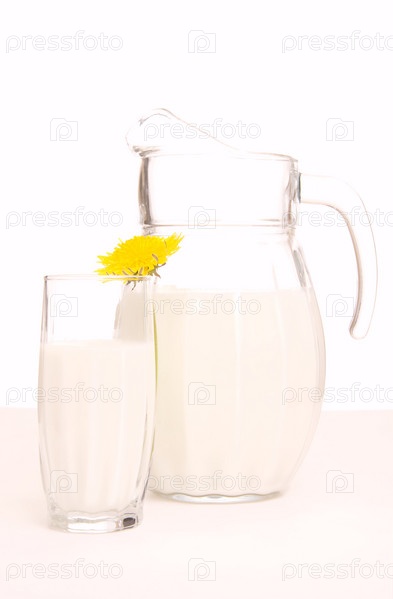 Стеклянный кувшин со свежим молоком и желтые цветы на белом фоне