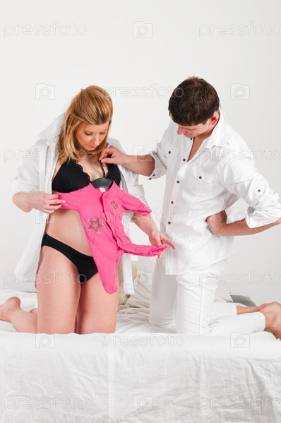 Молодая пара примеряет детскую одежду к животу беременной жены