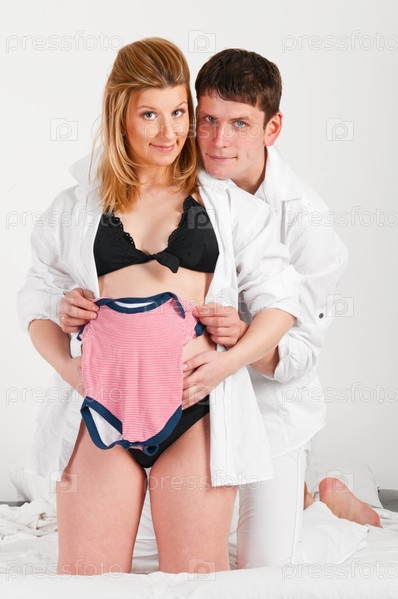 Молодая пара примеряет детскую одежду к животу беременной жены