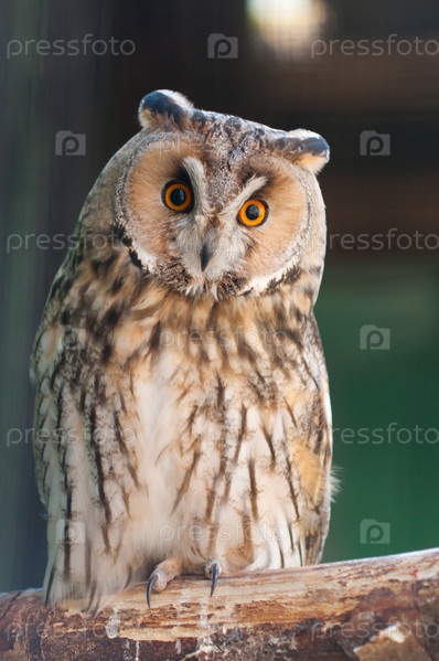 Ушастая сова сидит на ветви в зоопарке