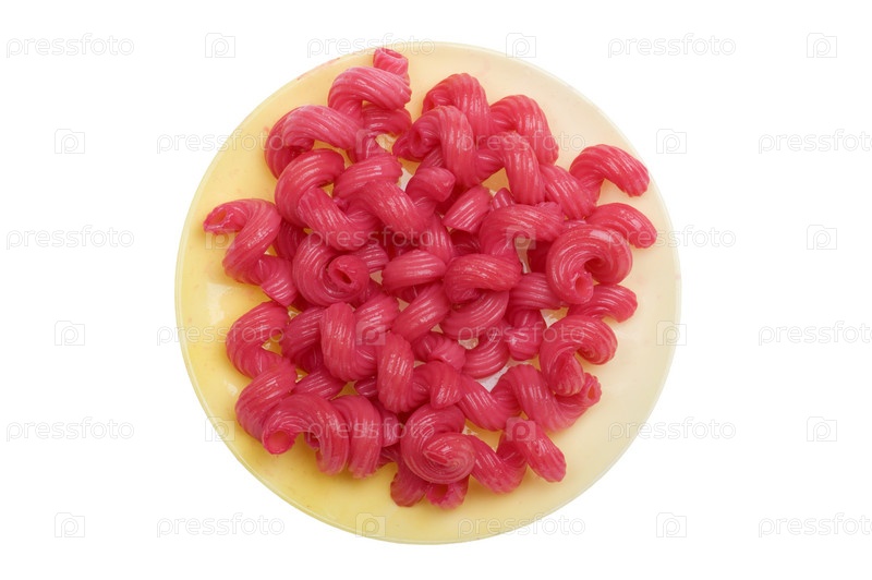 Тарелка макарон красного цвета на белом фоне