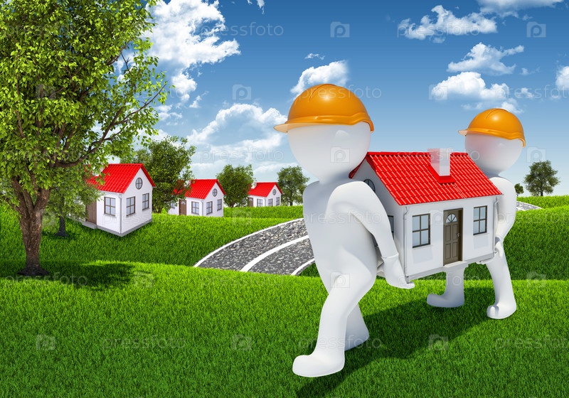 Два человека несут маленький белый дом