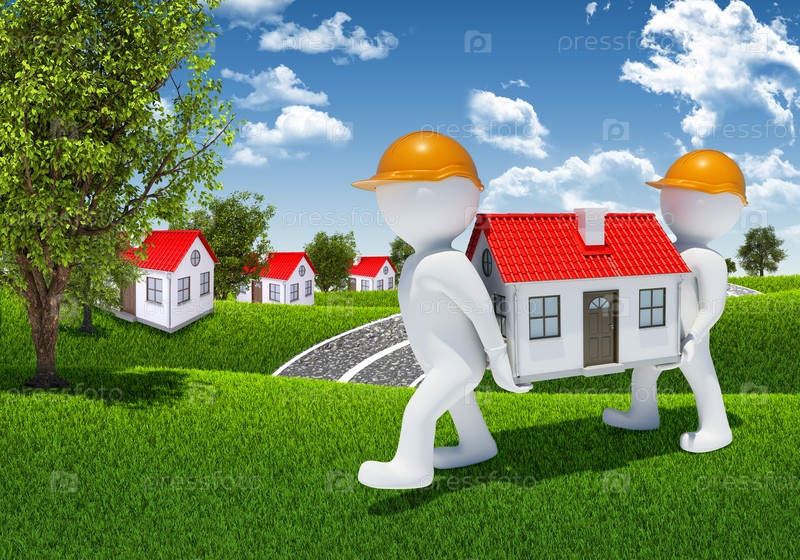 Два человека несут маленький белый дом