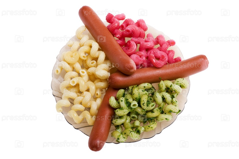 Макароны с сосисками на тарелке на белом фоне