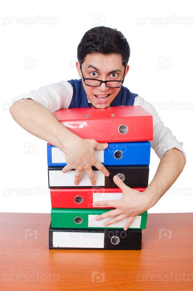 Забавный мужчина с кучей документов