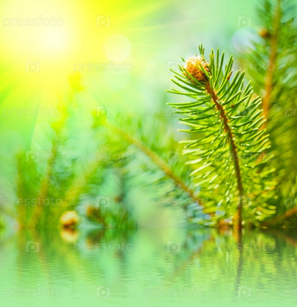 Зеленые ветви сосны отражаются в воде