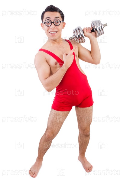 Забавный парень с гантелями