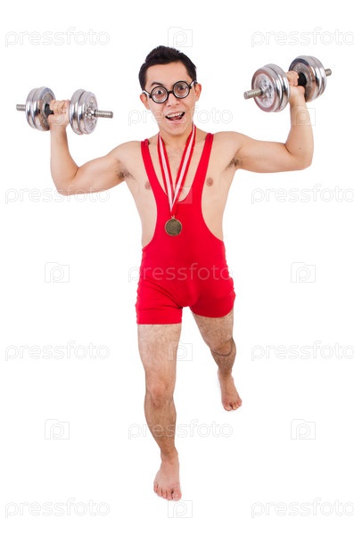 Забавный парень с гантелями