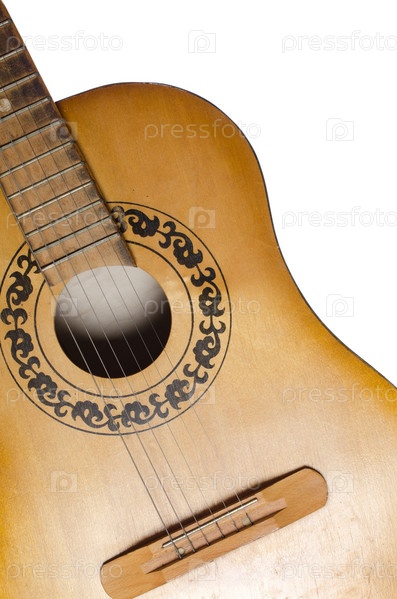 Акустическая гитара крупным планом на белом фоне