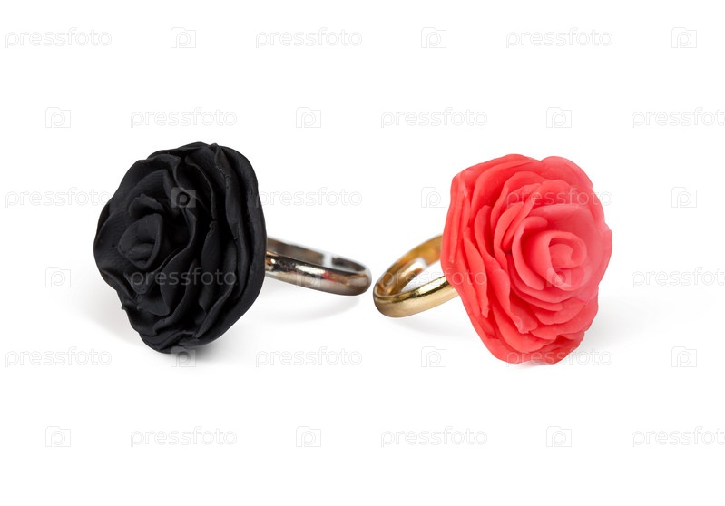 Кольца в виде черной и красной роз на белом фоне