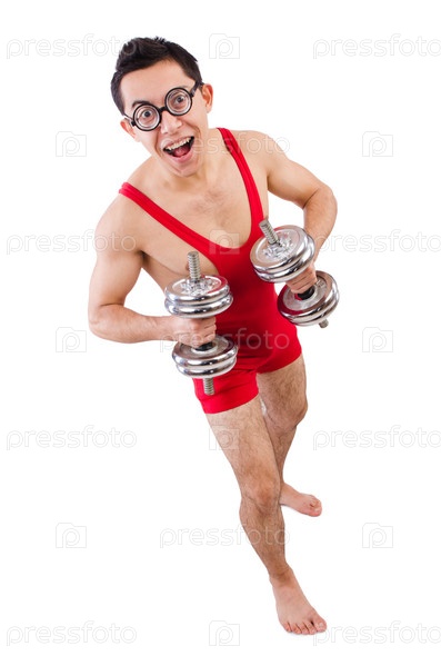 Забавный парень с гантелями