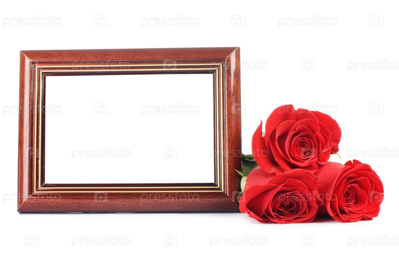 Красные розы и пустая рамка на белом фоне