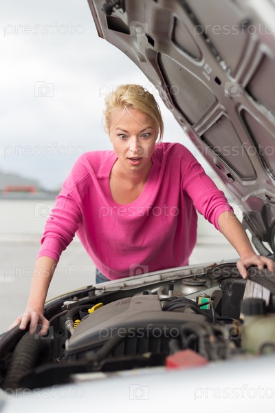Расстроенная женщина и сломанный автомобиль