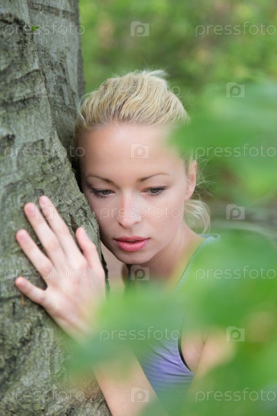 Молодая женщина обнимает дерево