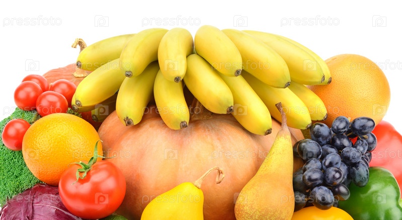 Фрукты и овощи на белом фоне