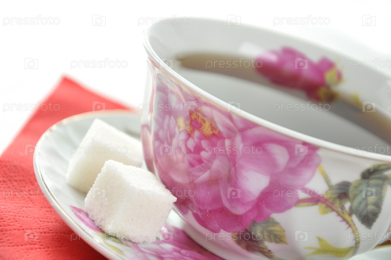 Чашка чая и сахар, изолированы на белом