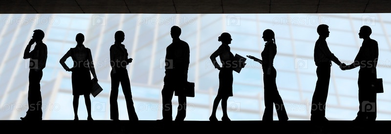 Несколько силуэтов бизнесменов, взаимодействующих на синем фоне