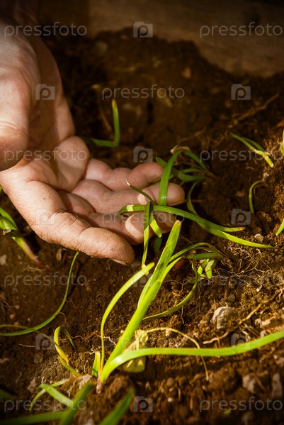 Женская рука садит растение