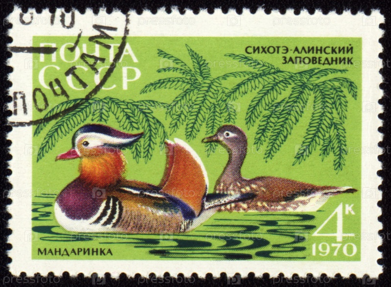 Советская марка 1970 года, изображающая утку-мандаринку, серия Сихотэ-Алинского заповедника