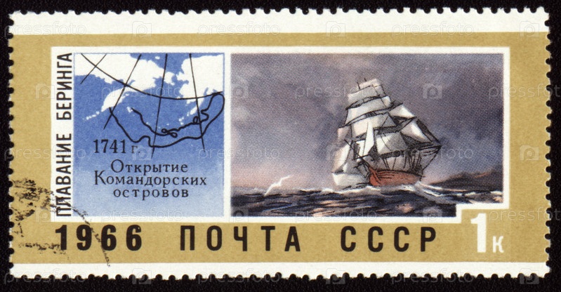 Советская марка 1966 года, изображающая открытие Командорских островов Берингом