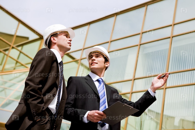 Фото двух коллег, обсуждающих новый проект с современным зданием на заднем плане