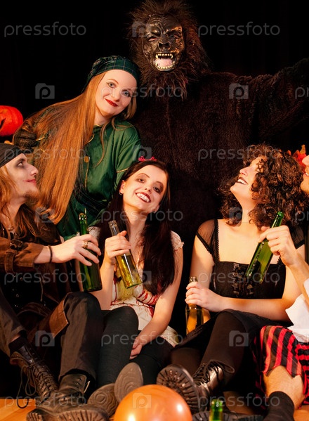 Группа молодых людей празднует Хэллоуин