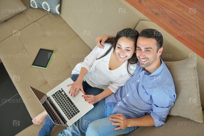 Молодая пара с ноутбуком на диване
